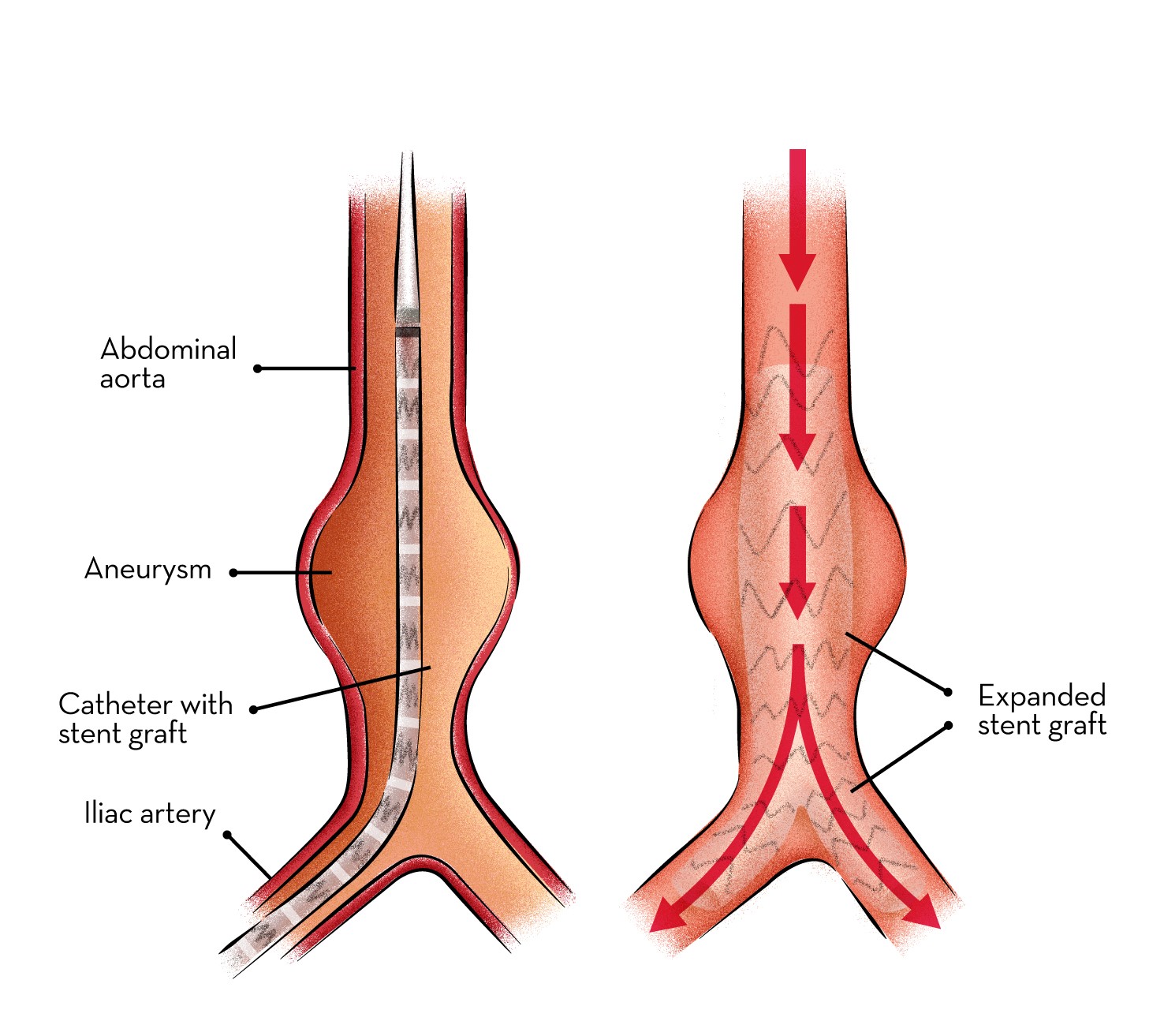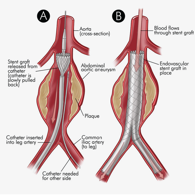 The procedure is carried out in a sterile environment under fluoroscopic (X-ray) guidance. The procedure can be performed under general, regional (spinal or epidural) or even local anaesthesia. After accessing the patient's femoral arteries (leg arteries), vascular sheaths are introduced into them, through which guide wires (small calibre wires), catheters (plastic tubes) and the endograft (stent graft) are passed. Diagnostic angiography (images of disease segment) of the aorta helps to determine the location of the patient's arteries, so the stent graft can be deployed without blocking these. The “main body” of the endograft is placed first, followed by the “limbs” which join the main body and extend to the iliac arteries, effectively protecting the aneurysm sac from blood pressure. The endo graft acts as an artificial lumen for blood to flow through, protecting the surrounding aneurysm sac. This reduces the pressure in the aneurysm, which itself will usually thrombose and shrink in size over time. The procedure itself generally takes 2 to 3 hours. Patient will stay in the hospital for 1 to 2 days. Full recovery will take about a month