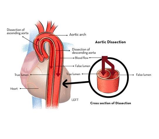Aortic dissection or Dissecting Aneurysm of Aorta occurs when the inner layer of the aorta called intima develops a tear and blood under high-pressure separates the inner from outer layer of the media to produce a false lumen causing weakness and subsequent dilatation called aortic dissection or dissecting aneurysm of aorta.