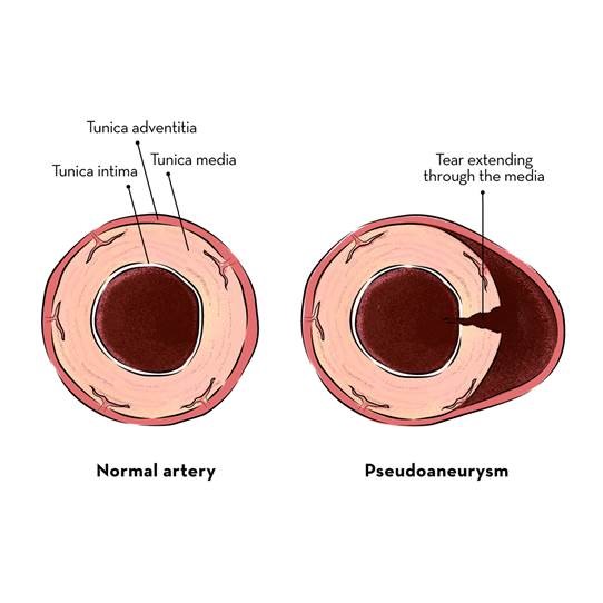 False aneurysm of aorta is a collection of blood surrounded by connective tissue outside the aortic wall. It happens due to small tear or small rupture of the aortic wall.