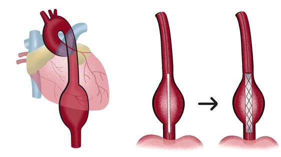 Stent grafts are used in transcatheter endovascular aortic repair (EVAR) procedures to seal aortic aneurysms. The grafts usually consist of a self-expanding stent frame that is covered with material to seal the vessel walls and prevent blood leaks feeding the aneurysm.The stent graft is a tube made of a thin metal mesh (the stent), covered with a thin polyester fabric (the graft). The tube is collapsed so it is narrow and can fit through your blood vessel. When the stent graft reaches the aorta, it is opened up and fastened in place.